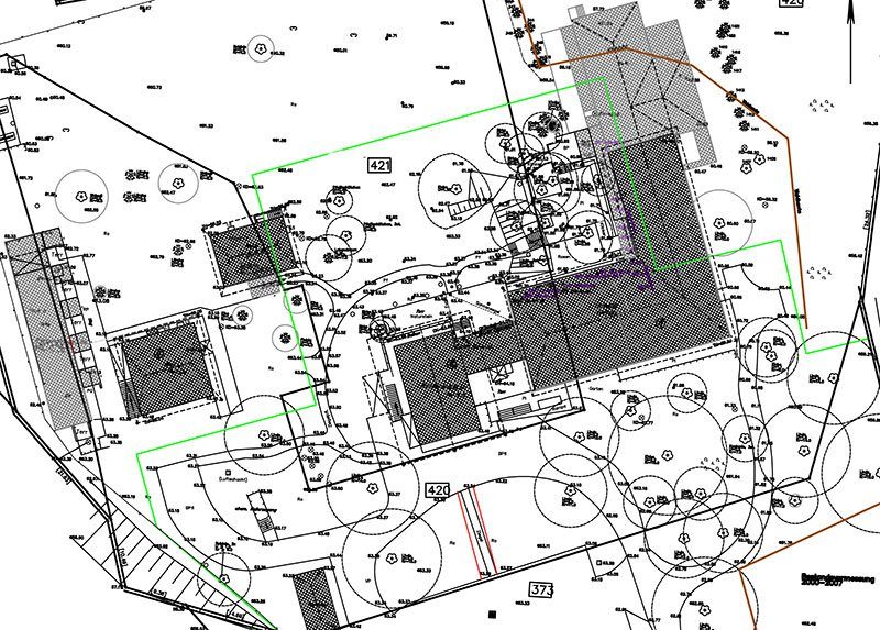 Die Grundlage für einen Bestandsplan ist die Vermessung aller relevanten Punkte in Lage und Höhe auf Ihrem Grundstück. Der Bestandsplan ist eine zwingende Voraussetzung für die Gartenplanung. Die Messpunkte sind stets individuell auf das jeweilige Grundstück zugeschnitten und werden von der zuständigen Planerin festgelegt.